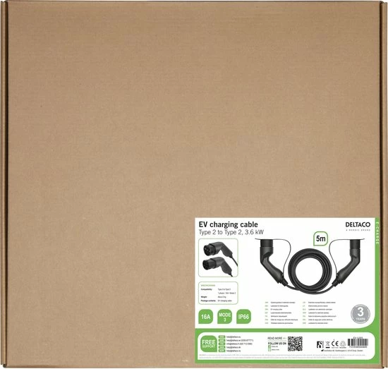 De DELTACO e-Charge EV-1205 laadkabel past op alle voertuigen met een Type 2-stopcontact voor wie via een openbare laadpaal of thuis via een eigen laadbox met Type 2-stopcontact, het zogenaamde 3 modi opladen, wilt opladen. Oplaadvermogen tot 3,6 kW. Verzilverde aansluitingen garanderen goed contact en een lange levensduur. Lengte 5 m. Voorzien van stofkap ter bescherming tegen stof, vuil en vocht tijdens opslag. De kabel is gemaakt van TPE-materiaal dat goed bestand is tegen olie, slijtage en uv-licht. De kabel is ook flexibel in koude omstandigheden. Type 2-stopcontacten zijn nu standaard in de EU. Auto’s van bijvoorbeeld de volgende fabrikanten AUDI, BMW, Hyundai, KIA, Mercedes, Porsche, Seat, Skoda, Tesla, Volkswagen, Volvo gebruiken allemaal Type 2-stopcontacten. Het opladen van de auto wordt gemonitord door een tweerichtingscommunicatie tussen de auto en de lader. Wanneer de kabel in de auto wordt gestoken, wordt eerst een zelftest uitgevoerd die controleert of de kabel goed is aangesloten en dat de auto klaar is om stroom te ontvangen, voordat het laden kan beginnen en de kabel mechanisch op spanning is vergrendeld. Dit beschermt zowel tegen diefstal als tegen onbevoegd gebruik tijdens het opladen. Ontgrendel de auto na het opladen zodat het mechanische slot opengaat en haal eerst de laadkabel aan de zijkant van de auto eruit zodat deze door de oplader wordt losgekoppeld. De kabel mag niet worden gerepareerd of gesplitst, omdat dit de veiligheid en functie kan beinvloeden. Certificering: TUV 2 PfG 1908 Kabel: EV07EE-H, 3G 2,5 mm + 1 x 05 mm Classificatie: IP66 Gewicht: 1,6 kg Bedrijfstemperatuur: -30C – +50C