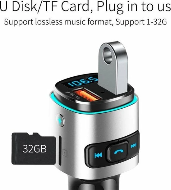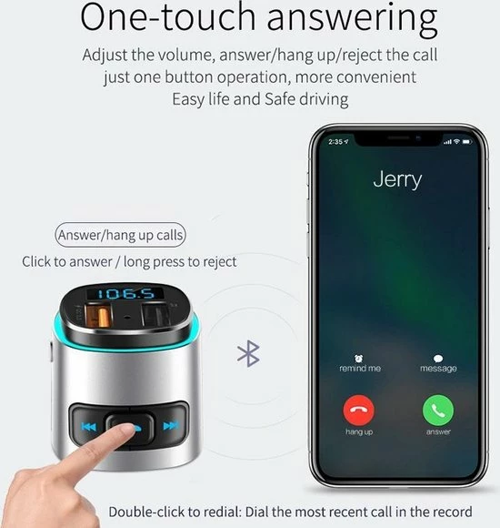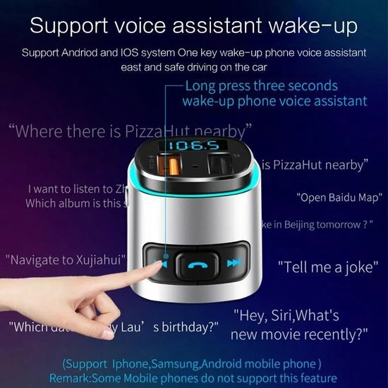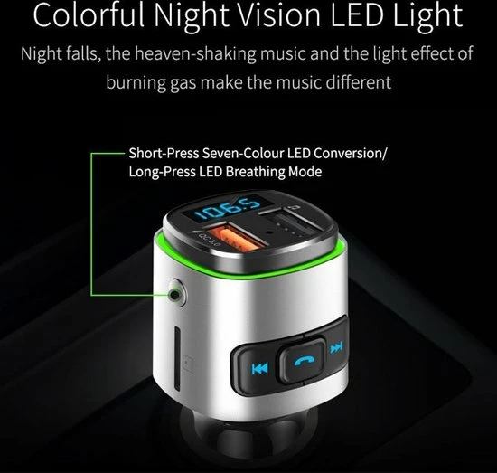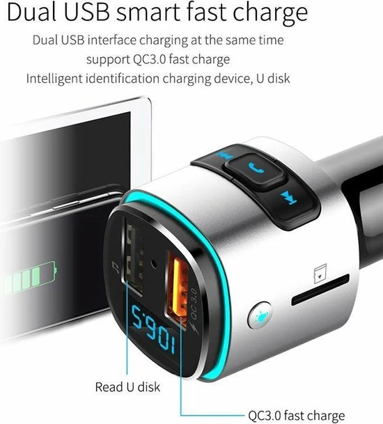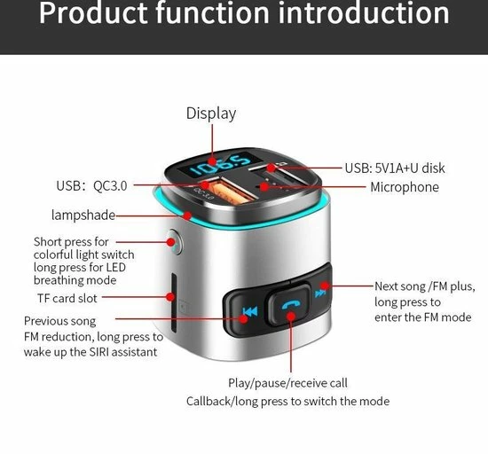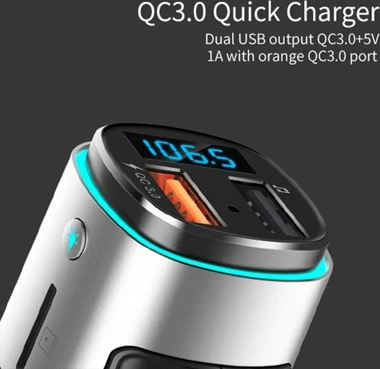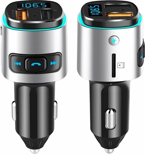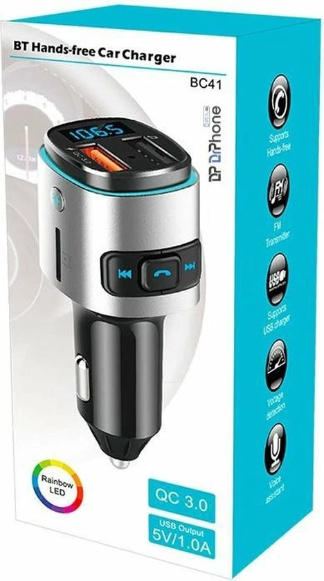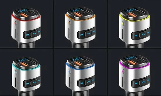 Dit is een multifunctionele car charger. Met dit product kan je twee telefoons opladen op het zelfde moment. Daarnaast kan je ook zien hoeveel voltage door het product heen gaat zodat je nooit teveel stroom kan verspillen. Ook kunnen telefoons opgenomen worden en kan het funcioneren fm transmitter. Naast al deze funties heeft het ook een design met LED lichten.