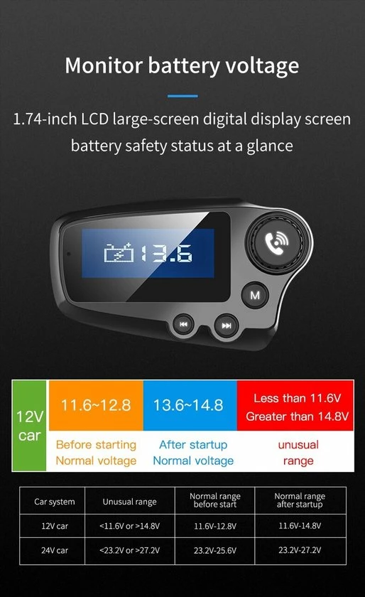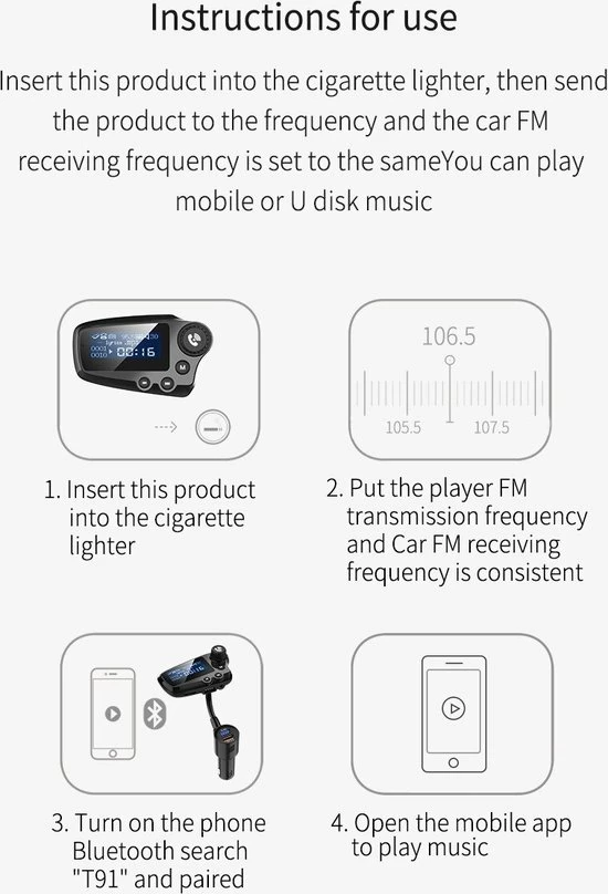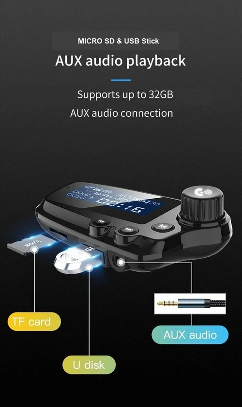 Vier muziekafspeelmodi: Geniet van 4 muziekafspeelmodi: behalve Bluetooth kun je ook muziek op je apparaat overbrengen naar autoradio via een 3,5 mm AUX audiokabel, deze ondersteunt ook een MicroSD-kaart tot 32G en een USB Stick mogelijkheid.