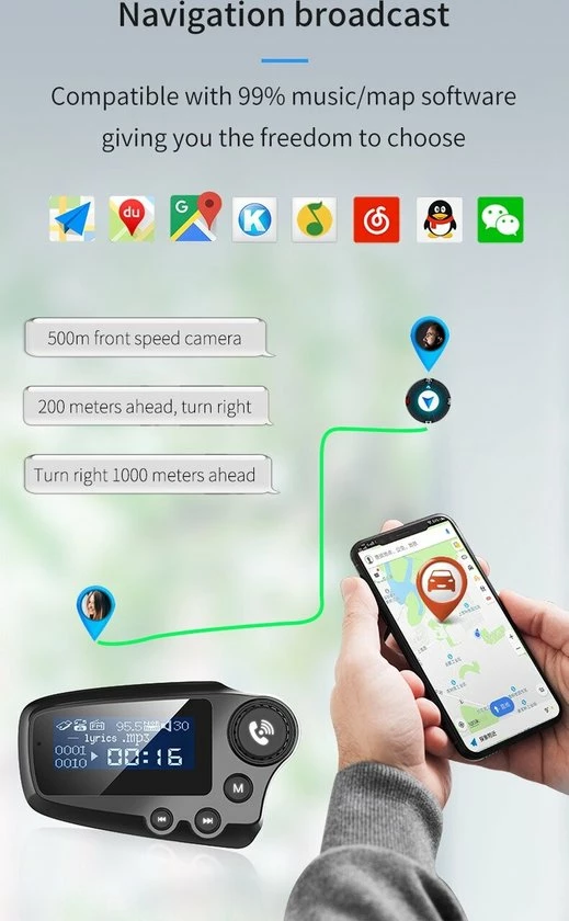Handsfree bellen maakt autorijden veiliger : Mogelijk moet je tijdens het rijden een belangrijk gesprek aannemen, Bluetooth handsfree beantwoorden met รฉรฉn toets en spraaknavigatie gebruiken om veilig rijden te garanderen. Door gebruik te maken van CVC-ruisonderdrukkingstechnologie, stelt de FM-zender je in staat om handsfree te kunnen bellen.