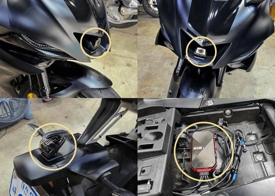 De externe hoofdmodule (DVR) wordt los op de motor geplaatst en verbonden met camera middels de 1.5 meter lange kabels. De DVR wordt voorzien van stroom middels de meegeleverde 5V 2.0A voeding (3 meter). In de DVR zit tevens de Wifi module verwerkt en hierin wordt ook de MicroSD kaart geplaatst.