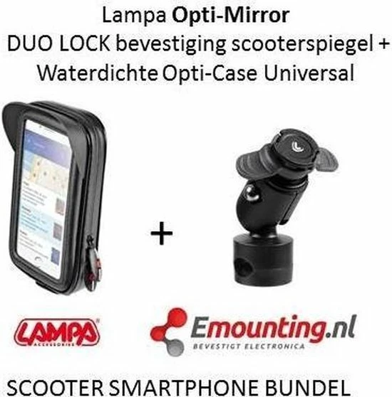 Combinatie Voordeelbundel van Lampa Opti-Mirror DUO LOCK bevestiging scooterspiegel +Lampa Waterdichte Opti-Case Universal.