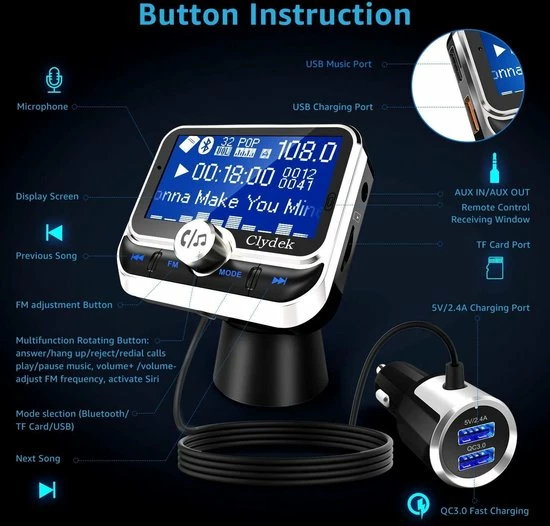 - ? Snel opladen in de auto: de audiozender ondersteunt QC3.0 snel opladen, die 4 keer sneller oplaadt dan traditionele oplaadpoorten. Een andere USB-oplaadpoort ondersteunt 5V/2.4A uitgang naar uw mobiele telefoon of tablet. Het kan twee mobiele telefoons tegelijkertijd opladen.