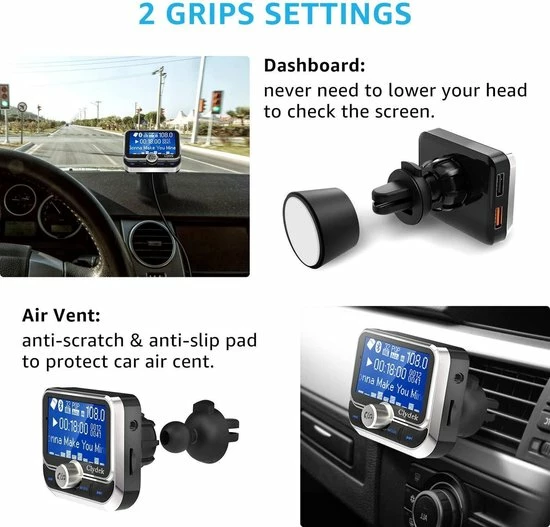 - ?2 Installeer Manieren & 1,8 inch Groot scherm: de hoofdFM-zendereenheid is uitgerust met een airconditioningclipbeugel en een 3 mm zelfklevende stickbasis, je kunt hem op de ontluchter van de auto monteren of op het dashboard plakken. 1,46 inch groot scherm auto FM-zender kan duidelijk het telefoonnummer/autospanning/FM-frequentie/muzieknaam weergeven.