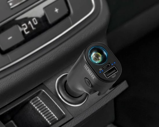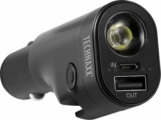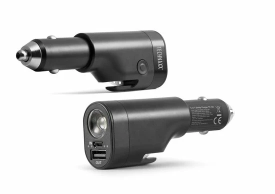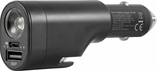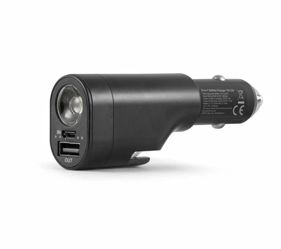Technaxx TX-123 6-in-1 Autolader 12V-24V, veiligheidshamer, gordelsnijder, zaklamp en powerbank Zwart