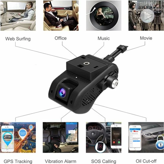 Auto DVR Dash Camra ,Realtime tracking, Rijden geschiedenis afspelen, Verslag, Geo-fence, mlultiple alarmen; Wanneer de ACC is op, alarm en indicatoren zal onmiddellijk stoppen. Wanneer de ACC is uitgeschakeld, 5 minuten vertraging en trillingen alarm zal worden ingeschakeld. Als trillingen gedetecteerd, apparaat zal alarm in 10s.