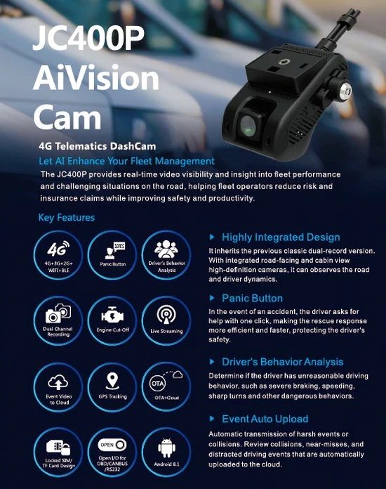 JC400P AiVision Cam is de topklasse geรฏntegreerde video telematica dashcam oplossing voor vloten.