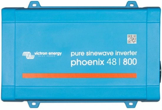 De Victron Phoenix 48/800 omvormer die 48V accu’s omzet naar een 230V aansluiting. De Victron Phoenix levert een continu vermogen van 800VA.